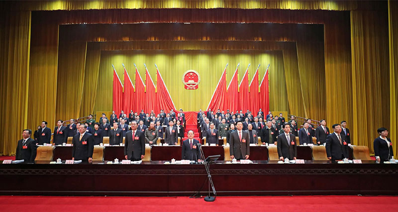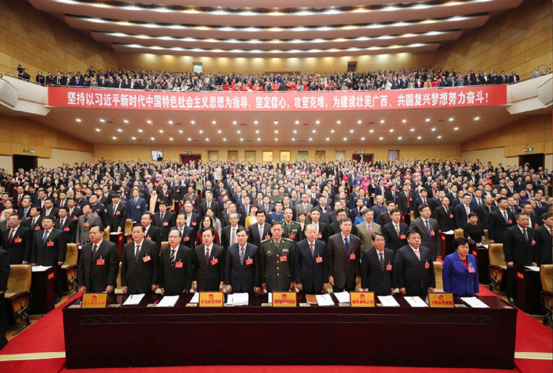 上午9時(shí),鹿心社宣布:廣西壯族自治區(qū)第十三屆人民代表大會(huì)第二次會(huì)議開幕。全體起立,高唱中華人民共和國國歌。