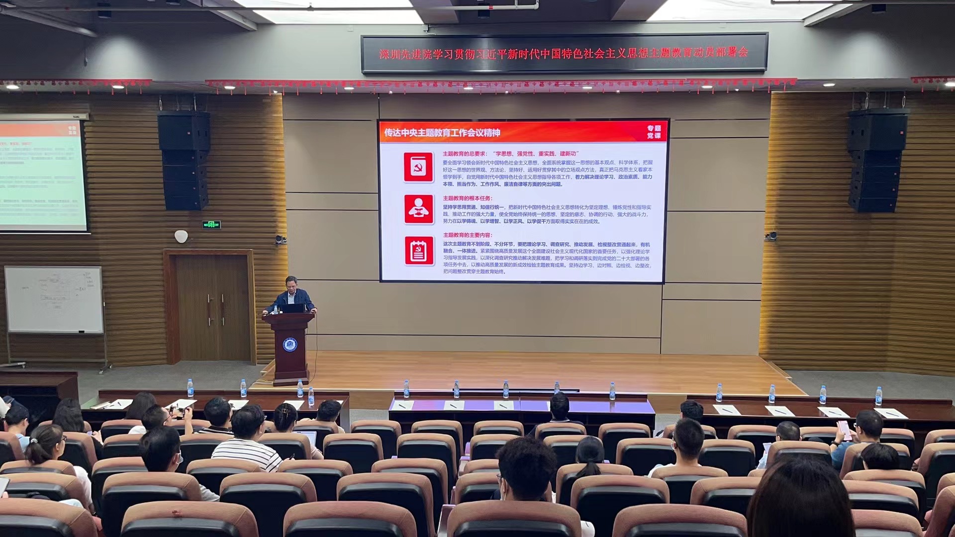 吳創(chuàng)之作《開展主題教育 凝心聚力 引領(lǐng)高質(zhì)量發(fā)展》專題黨課報(bào)告,傳達(dá)學(xué)習(xí)了習(xí)近平總書記在學(xué)習(xí)貫徹習(xí)近平新時(shí)代中國特色社會(huì)主義思想主題教育工作會(huì)議上的重要講話精神、中科院學(xué)習(xí)貫徹習(xí)近平新時(shí)代中國特色社會(huì)主義思想主題教育動(dòng)員大會(huì)精神,并對深圳先進(jìn)院開展主題教育提出要求和進(jìn)行動(dòng)員。