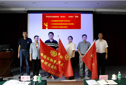 “三園”黨委書記(右1為魏平、左1為甘煩遠(yuǎn)、左2為尚納新)為華南植物園“突擊隊(duì)”“先鋒隊(duì)”團(tuán)隊(duì)授旗