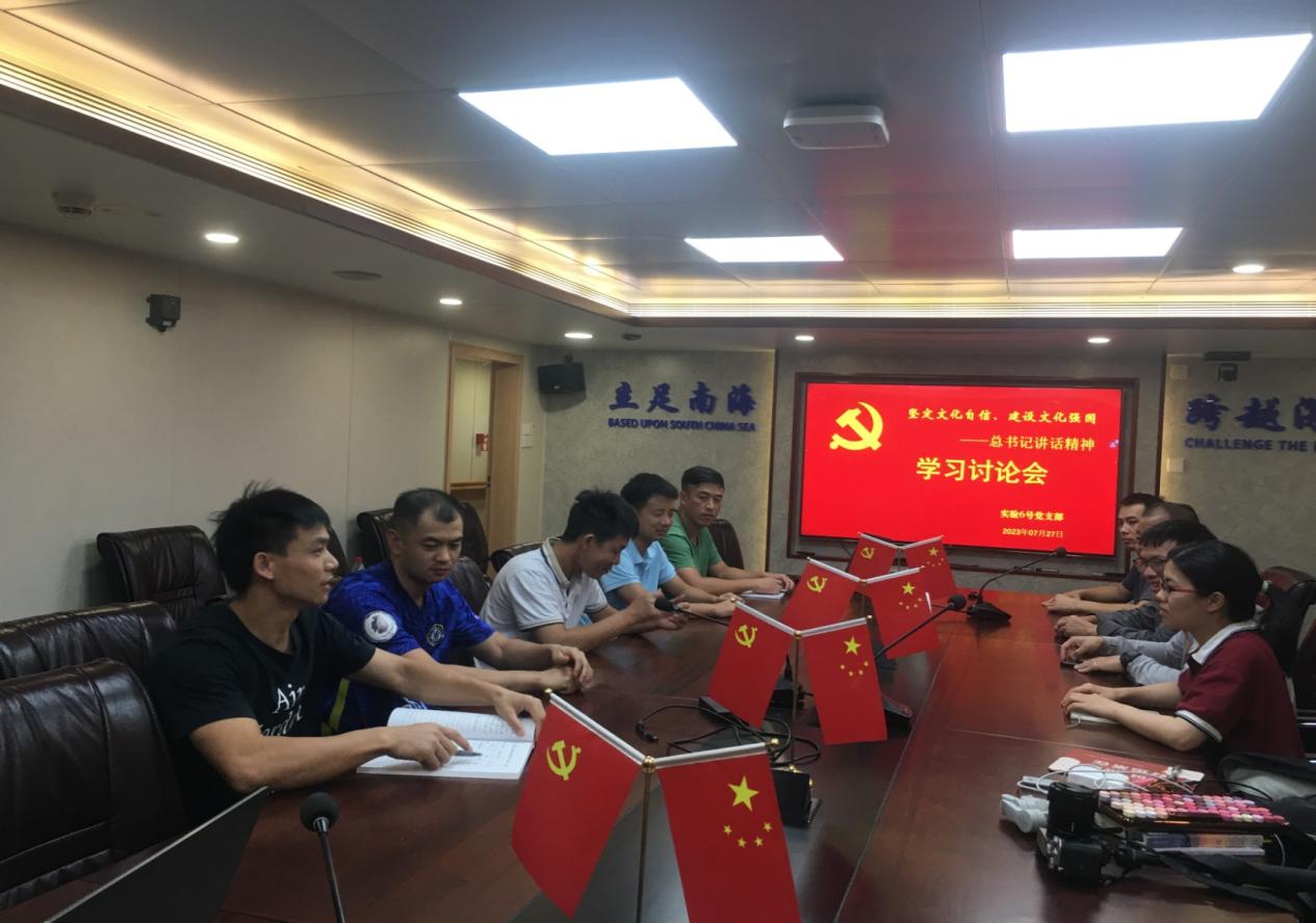 7月27日下午,南海海洋所實驗6號黨支部以“堅定文化自信、建設文化強國”為主題在海上召開學習討論會。會議由黨員輪機長黃文權主持,支部成員及入黨積極分子參加。