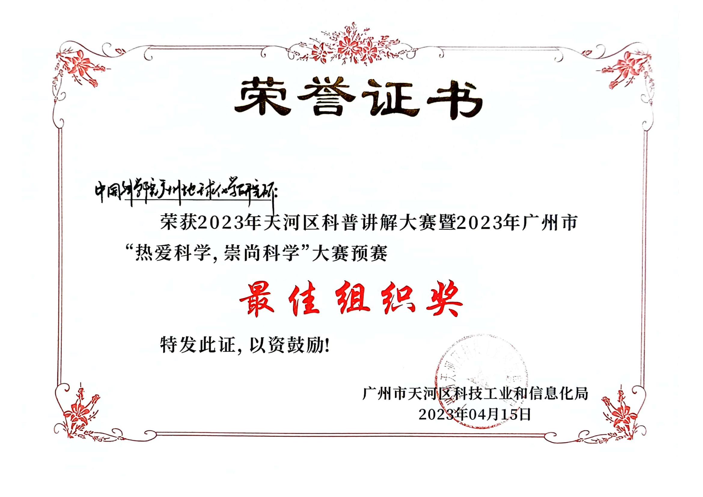 4月15日,由廣州市天河區科技工業和信息化局、廣州市天河區科學技術協會聯合主辦的2023年天河區科普講解大賽暨2023年廣州市“熱愛科學,崇尚科學”大賽預賽在天河棠下·智匯PARK圓滿落下帷幕。中科院廣州地球化學研究所4名選手參加成人組科普講解大賽,經過激烈角逐,王國翔獲得大賽三等獎,郝露露、李亞歡、尹緒娜獲得大賽優秀獎。其中,中科院廣州地化所獲得“最佳組織獎”榮譽稱號。