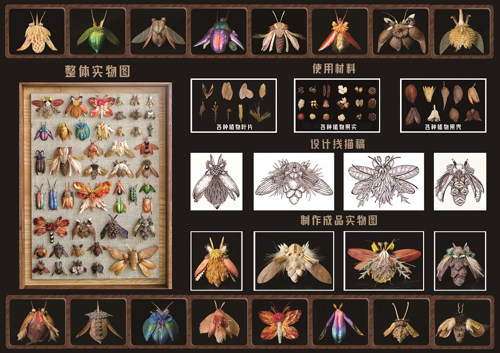 華南植物園選送的榮獲大賽三等獎作品“涅槃群生--植物昆蟲系列手作”,創(chuàng)作靈感源自于大自然的恩賜,其中所用的200多種花、果、葉、種子等材料無一不是擷取于自然界,通過精心設(shè)計、藝術(shù)融合和巧妙制作,最終以栩栩如生的昆蟲形態(tài)展示出來。作品不僅將枯與榮、動與靜的植物完美整合,賦予枯枝殘葉新的生命,而且在保持自然物原本狀態(tài)的同時,又具有嶄新的元素和質(zhì)量的升華,化腐朽為神奇,給觀者展現(xiàn)出耳目一新全景式的自然界。該作品設(shè)計制作者表示,大自然中賦存著無以數(shù)計美妙絕倫的物質(zhì)和遠勝人類施教的影響力量,無疑是一切藝術(shù)創(chuàng)造的泉源。將創(chuàng)作靈感與自然物質(zhì)的巧妙結(jié)合,就在于著意塑造全新美感,引導(dǎo)人們遵從自然、受惠自然、領(lǐng)悟自然,并與自然和諧相處。