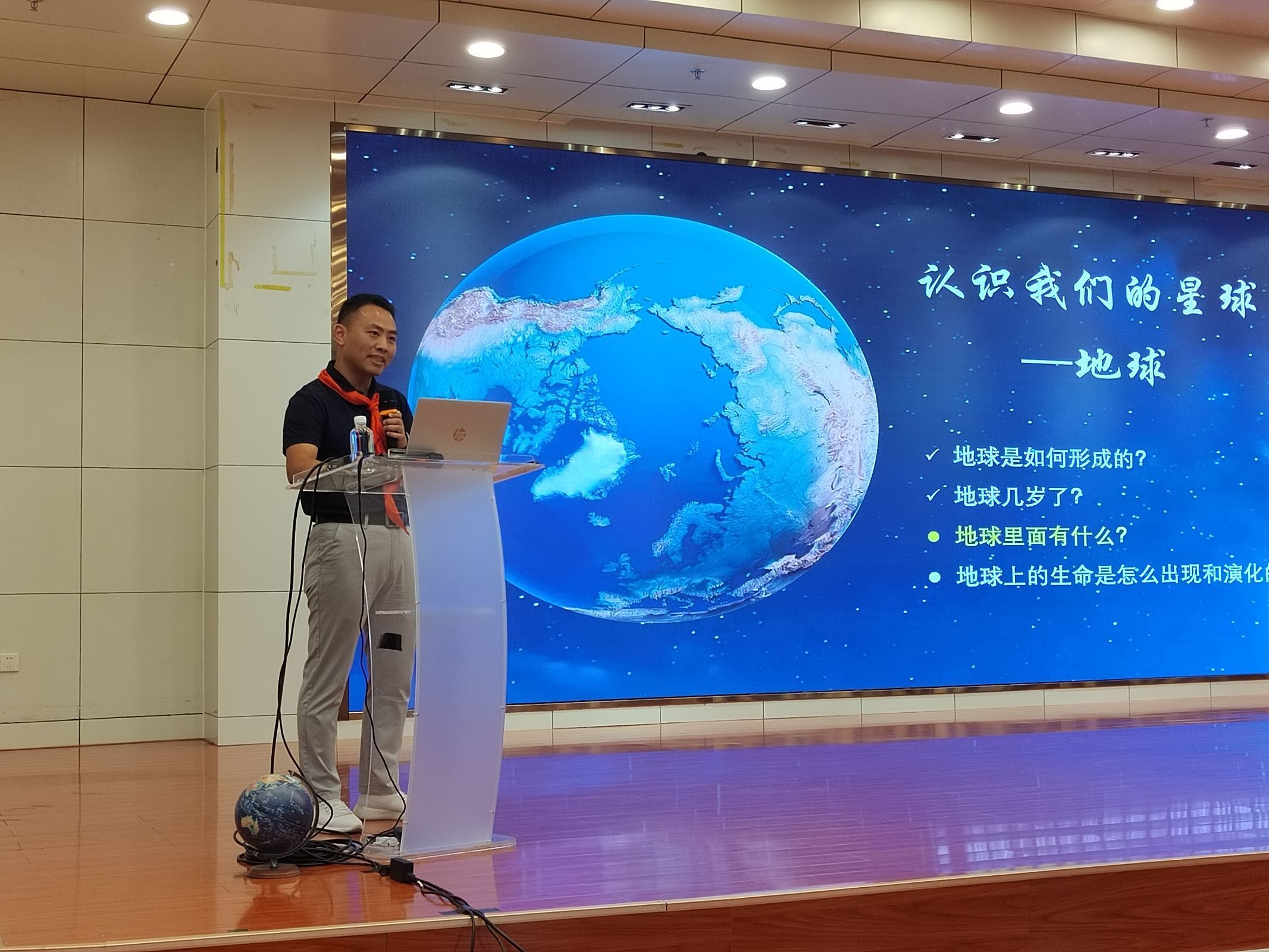 馬林研究員從地球是一顆美麗而特殊的星球開始,講述了“地球是如何形成的?”“地球的內部有什么?”和“地球上的生命是怎么誕生和演化的?”三個主要方面的內容。報告以視頻、圖片和故事等形式講述了地球和月球的誕生、地球早期的環境、月球正面和背面的地貌差異及原因、人類如何認識地球的內部結構、生命演化的過程、生物大滅絕的潛在原因等內容,展示了地球生命的孕育與演化的宏大畫卷。他通過地球科學知識和知識背后的科學故事講解以及趣味問答和科學實驗,為孩子們上了一堂生動的“科學課”。