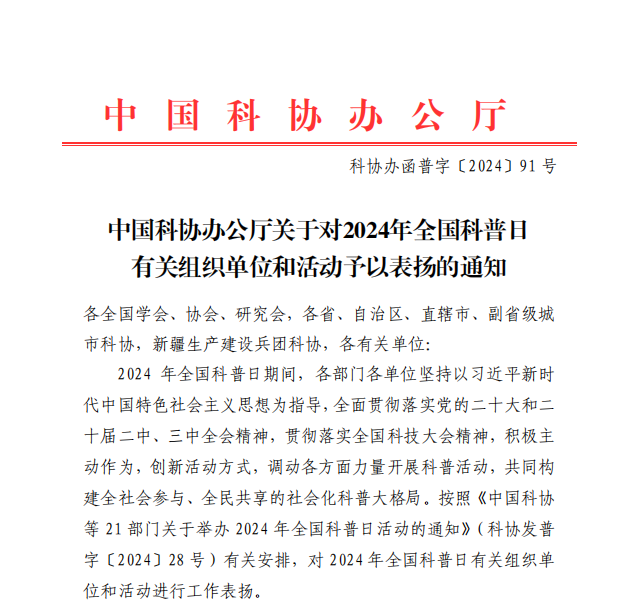 1月12日獲悉,中國科協發布了《關于對2024年全國科普日有關組織單位和活動予以表揚的通知》。通知指出“2024年全國科普日期間,各部門各單位貫徹落實全國科技大會精神,積極主動作為,創新活動方式,調動各方面力量開展科普活動,共同構建全社會參與、全民共享的社會化科普大格局。按照《中國科等21部門關于舉辦2024年全國科普日活動的通知》(科協發普字〔2024〕28號)有關安排,對2024年全國科普日有關組織單位和活動進行工作表揚。”