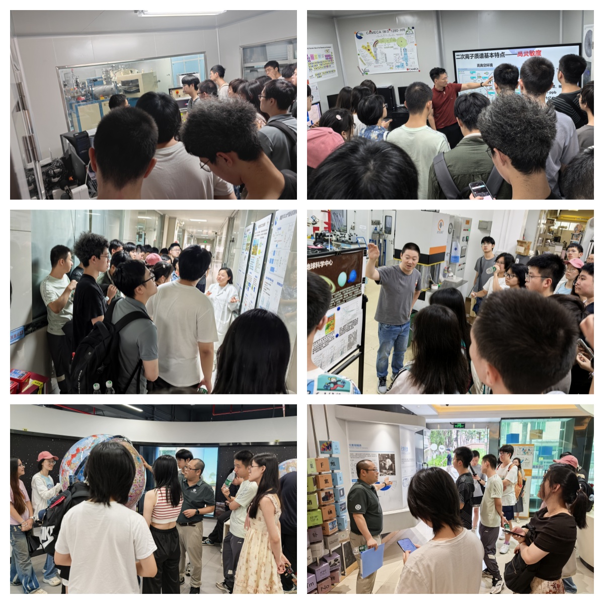 報告結束后,師生們先后參觀了碳十四專用加速器質譜儀、二次離子探針質譜儀實驗平臺、大型室內煙霧艙、高溫高壓中心等重點科研平臺,近距離接觸研究所核心科研設備,直觀感受實驗技術對科學研究的重要支撐。隨后,參觀了地學與資源科普基地,通過深入淺出的講解和豐富的展品與互動體驗,加深了師生們對地球科學和環境科學的認知。