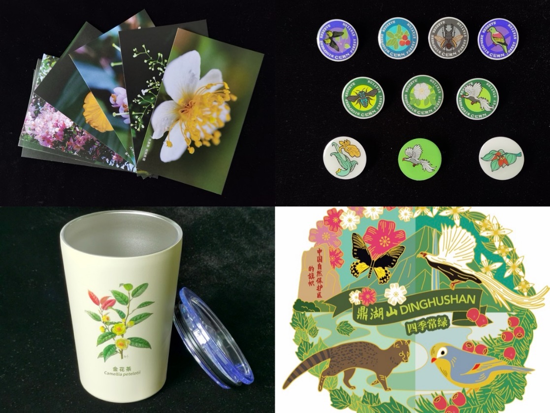 鼎湖山四季冰箱貼以保護區不同季節的特色景觀和生態環境為主題,以昆蟲(金裳鳳蝶)、鳥類(紅嘴相思鳥、白鷴)、獸類(豹貓)為核心,覆蓋鼎湖山不同類群珍稀生物,通過冰箱貼的形式進一步豐富文創對物種多樣性的呈現維度;物種多樣性系列文創則聚焦保護區內豐富的動植物資源,產品涵蓋徽章、水杯、明信片三大類,每類產品均深度融合鼎湖山獨特的生態資源,兼具觀賞性、實用性與科普性。