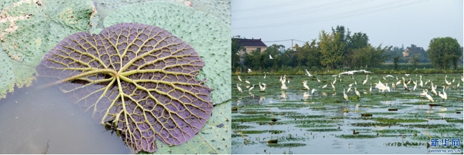 圖4 芡實葉背獨特的葉脈結構(左 徐一大 攝)及在葉片上活動的中白鷺(右?圖片來源:新華網) ????