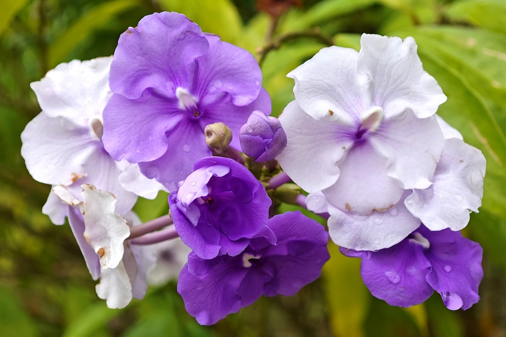 ?????? 大花鴛鴦茉莉(Brunfelsia pauciflora)雖然來自遙遠而溫暖的拉丁美洲,卻喜歡在廣州的冬、春季盛放,因花有紫、白二色而得名。根據它的花色特點,它的英文名叫“yestoday-today-tomorrow”,聰明的你,可找到了它名字背后的奧秘?