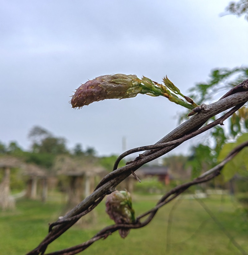 ????“紫色的瀑布遮住了粗壯的盤(pán)虬臥龍般的枝干,不斷地流著,流著,流向人的心底。” 對(duì)于我們大多數(shù)人來(lái)說(shuō),印象最深的紫藤要數(shù)初中課本宗璞寫(xiě)的《紫藤蘿瀑布》,文中的紫藤猶如天幕垂簾,壯麗迷人。難免心中有些疑問(wèn),廣州的紫藤為啥沒(méi)有開(kāi)成瀑布?廣州不是紫藤的原產(chǎn)地,有點(diǎn)“水土不服”,再加上紫藤一般二十年老樹(shù)才會(huì)爆花,藤本園的紫藤于2015年種植,還年輕著呢。由于種種原因,廣州的紫藤花量少花期短。不過(guò)不要緊,正如課本里寫(xiě)的那樣“花和人都會(huì)遇到各種各樣的不幸,但是生命的長(zhǎng)河是無(wú)止境的”。