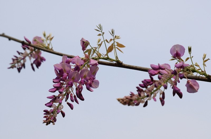 紫藤,紫穗滿垂綴以稀疏嫩葉