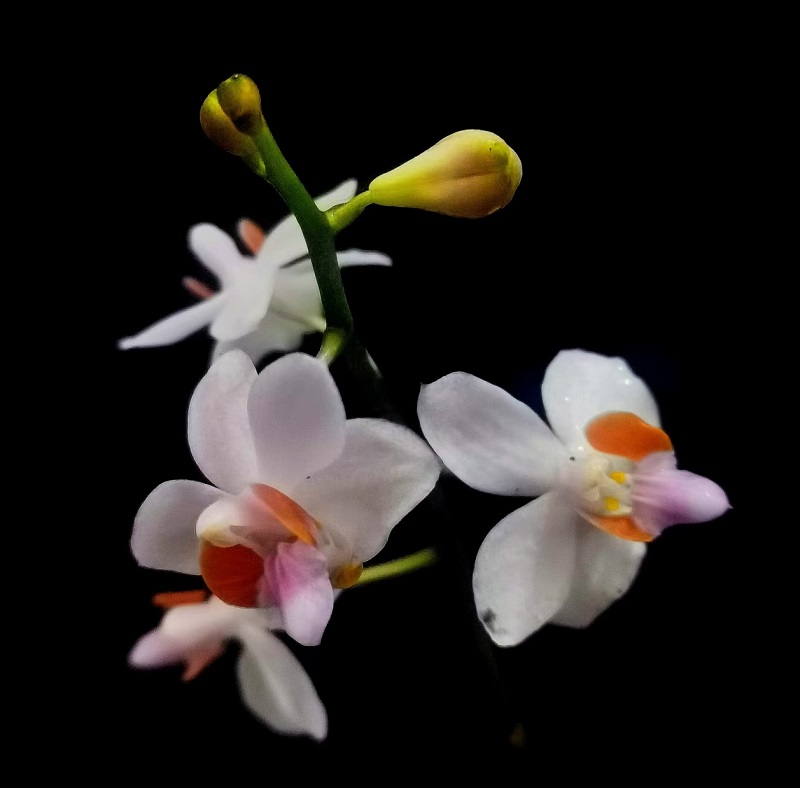 ????五唇蘭的葉片橢圓形肉質,細膩而富有質感,綠色的葉面有明顯的蠟質,在陽光的照耀下,葉面上仿佛涂抹了一層淡淡的光澤。五唇蘭的花葶抽生于基部,疏生十余朵具有香氣的小花,它的花小巧精致,花朵的顏色呈現出從純白到深紫的漸變,仿佛是自然界中最奇妙的調色板。在美麗而和諧的色彩的渲染下,五唇蘭的一個花序就是一個精心布置的藝術品,白色的小花仿佛夜空中溫柔的星光,深紫色和粉紅色的小花又似晨曦中初露的朝霞。