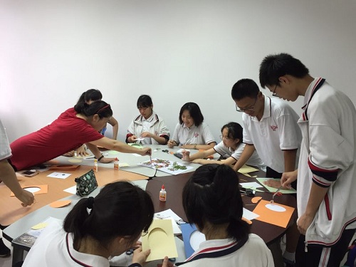 同學們在野外考察過程中還收集了不同顏色、形狀的樹葉、花瓣、果實等自然材料。在互動實驗室,在科普老師柯蕭霞的指導下,大家按組開始集趣味性與創新性為一體的大自然藝術品的制作。學生們充分發揮自己想象力和創作力,做出了栩栩如生的植物藝術作品,大自然藝術品的制作讓他們感受到自然界的多姿多彩,也體驗著自己動手創造的樂趣。