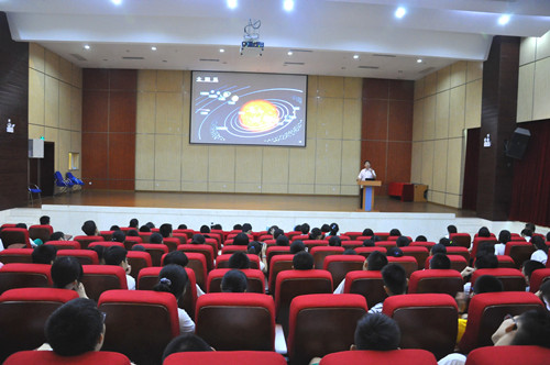 參觀結束后,陳鳴研究員為師生們做了“地球隕石坑:災難與財富的印記”科普報告。陳鳴用深入淺出的語言、大量圖文并茂的幻燈片,從科普的角度介紹了隕石坑的產生及定義、月球及地球隕石撞擊事件、天體撞擊事件給地球帶來的災難與財富,以及中國岫巖隕石坑的發現等科普知識,引起了師生們的極大興趣。臨近中午12點,師生們在標本大樓一樓會議廳仍鴉雀無聲地聆聽報告,報告結束后同學們還意猶未盡,與陳鳴進行了熱烈互動。