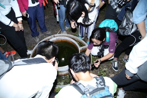 等到夜幕降臨,螽斯和蟋蟀爭相鳴唱,神奇的夜觀開始了。同學們有的手拿電筒,有的頭戴探燈,緊隨保護區(qū)工作人員左右,不一會兒就見到了喜歡在夜色濃稠里出沒的斑腿泛樹蛙,在強光的照射下一動不動;兩只可愛的鳥兒,緊緊相依,在樹枝上睡覺,羽毛蓬松,相互取暖,十分溫馨。接著,慢吞吞爬行的蝸牛、夜間出來覓食的東風螺、長相怪異的象鼻蟲、水里嬉戲的山坑魚,以及對周邊生活環(huán)境質(zhì)量要求很高的版納魚螈,都在我們探索的路上一一呈現(xiàn)。最后,同學們關掉電筒,放開思維,冥想靜靜的走在森林中,自己與大自然融為一體。