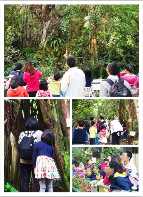 活動伊始,科普老師通過三個主題游戲向孩子們形象地介紹了小動物的演變過程、動植物之間的聯系、食物鏈和食物網的定義以及動物界弱肉強食、適者生存的法則。而弱肉強食的生存法則不僅存在于動物界,植物界也不乏其例……老師帶著孩子們走進神秘的熱帶雨林,觀察雨林中的各種植物為了生存而使出的種種招數。孩子們觀察發現細葉榕為了搶奪地盤用枝干上長出的氣生根絞殺其它植物,對于絞殺后形成的空心樹驚嘆不已。爾后,老師又圍繞植物界為什么會有絞殺現象、植物是如何絞殺、絞殺植物的種類等多個問題,進行了耐心講解和細致回答。