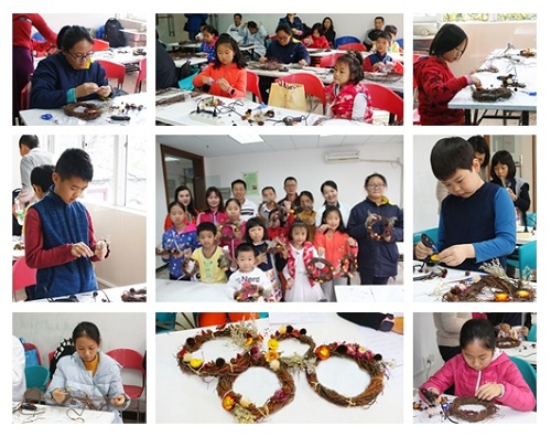 活動最后是手工制作課。在老師的傳授、指導,以及家長的幫助下,孩子們各自利用細葉榕的氣生根和植物干花、種子,制作了一個五顏六色的花環。孩子們端詳著手中的作品,個個臉上洋溢著幸福的笑容。