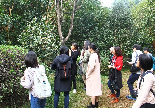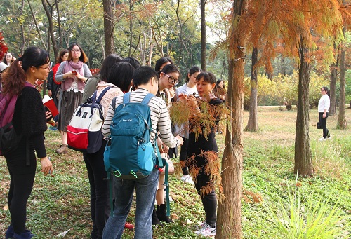 賞紅葉。燦爛陽光下紅葉冬景美不勝收,老師教大家如何區分落羽杉、池杉、水杉、水松這幾種紅葉樹種,讓學員們細致觀察它們的葉子結構和著生方式:落羽杉的小葉是條形互生的,水杉的葉子也是條形卻為對生,池杉是鉆形葉,水松有鱗形、鉆形和條形多種葉形并存,學員在賞花觀景的同時學到了豐富的植物學知識。