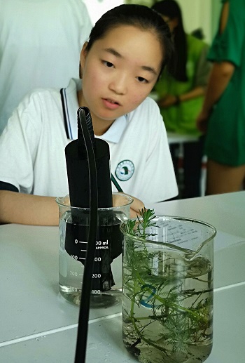 掌握了基本的實驗方法之后,同學們便開始興致勃勃地分組開展各項實驗,使用各類感應器獲取實驗對象的相應數值。如不同種類水的PH值、人呼出二氧化碳的量、土壤的干濕狀況及溫度、電筒的光照量、水中溶解氧量等。