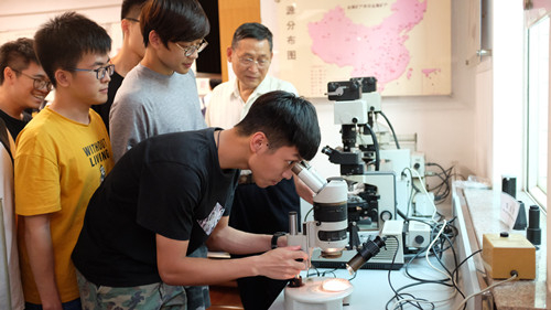 本次實習活動中,兩位老科學家簡要介紹了廣州地化所的歷史沿革,之后帶領同學們認識不同成因類型的巖石、千姿百態的礦物和新奇的化石標本,感受著我們這個擁有46億年歷史的地球奧妙。在學習過程中,老科學家們為同學們講解了各種石頭的用途:它們在建筑、化石燃料、國防建設以及藥物等各方面都扮演著不可或缺的角色。本次實習中同學們還實踐性的學習顯微鏡的使用方法,認真觀察鏡下的礦物組分,增強自身動手學習能力。整個實習過程中同學們認真思考、互動問答,并積極與老科學家探討隕石、各種寶石等科學問題。