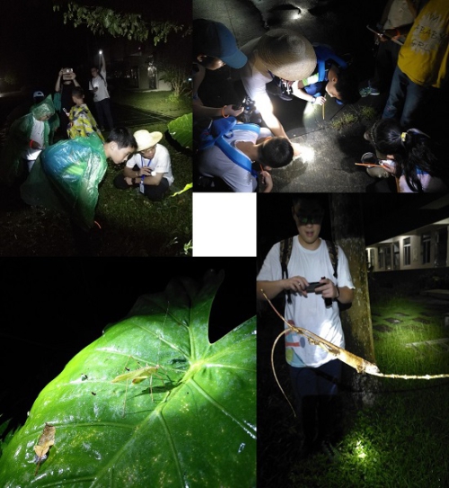 傍晚時分的一場雷陣雨把鼎湖山的空氣洗得干干凈凈,當夜幕降臨,池塘周圍的蛙聲及螽斯、蟋蟀的叫聲此起彼伏、格外清晰。小朋友們按耐不住心中的好奇去探尋鼎湖山的“黑夜精靈”,由于剛下過雨,地面潮濕,馬陸、黑眶蟾蜍及各種蝸牛隨處可見,此外還有螢火蟲、斑腿泛樹蛙、沼水蛙以及在樹上過夜的成年變色樹蜥和一只今年剛孵化的小變色樹蜥等。