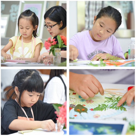 科普老師還為大家準備了新鮮的龍船花和鐵線蕨,以這兩種素材為例子,了解花、葉的形態和常識以及壓花常用工具和儀器使用方法。生動形象的理論課后就是小朋友們最熱衷的卡通壓花扇子制作課了。先由老師在投影上演示了制作步驟,然后小朋友選取自己喜歡的卡通人物進行扇面的制作。