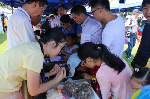 廣州地化所攜帶了電子顯微鏡和數(shù)十種經(jīng)過精心挑選的珠寶玉石、巖石、石油、冷泉沉積物、礦物/礦石、古生物化石等實物標本,組織了數(shù)位老科學家和在讀研究生科普志愿者為社會公眾耐心細致地講解了天然氣水合物的形成過程、石油的成因、原油的開采、各種常見礦物的識別及特征、地幔橄欖巖的形成、火山彈的成因、各種古生物化石的地質(zhì)意義以及電子顯微鏡下觀察巖石薄片的微形貌特征、基本礦物組成等地學科普知識,并就市民和青少年感興趣的地學與油氣科普問題進行了交流互動。