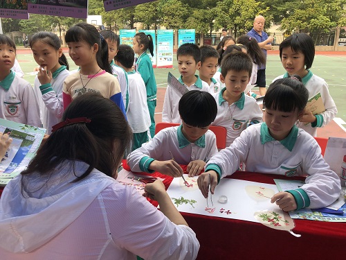 中國科學院華南植物園帶來了利用植物材料制作的漂亮的壓花作品、種子畫等植物藝術品展示,并由廣州市十佳科普講解員為師生介紹了近期開展的形式多樣的自然教育課程,引起了師生們的極大興趣。孩子們在現場體驗了一回壓花書簽的制作,一片薄如蟬翼的菩提樹葉脈配上幾朵小花和綠葉,轉眼間便做成一片精美的葉脈壓花書簽,令孩子們愛不釋手,從中不但感知到植物的美,也認識花葉的結構。“種子找媽媽”游戲激發了孩子們對植物識別的興趣,在幫種子找到媽媽的游戲過程中,了解到植物種子的巧妙結構和奇特的傳播方式,科學的小種子也悄悄地植入他們幼小的心靈中,孩子們紛紛表示回家后一定讓爸爸媽媽帶自己到毗鄰的植物園里認識更多的植物,和植物交朋友。