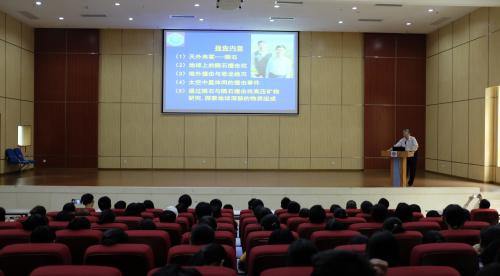 俄羅斯科學院外籍院士謝先德、同位素地球化學國家重點實驗室研究員張兆峰分別作了題為“天外來客—隕石和隕石撞擊坑”和“月球形成與我國探月工程”的科普報告。謝先德向大家展示了地球上獲得國際承認的隕石及隕石撞擊坑,科普了隕石的定義、分類和用途等基本地學知識;從地外撞擊出發揭示了恐龍滅絕的原因;介紹了隕石與隕石撞擊坑高壓礦物研究對探索地球深部物質組成的重要意義。張兆峰研究員為同學們講解了月球的起源說,包括最初的共生說、捕獲說、裂解說,到后來的大撞擊過程、月球巖漿洋假說等,詳細介紹了我國探月工程的進程及每一階段的主要任務和技術革新情況。現場觀眾提問不斷,例如,“有傳聞說月球是空的,美國阿波羅探月計劃是為了尋找外星人,這是真的嗎?”、“月球平均以4厘米每年的速度逃離地球,將會對我們地球產生什么影響?”、“對于日本實現小行星探測器登陸,NASA研發的OSIRIS-Rex行星探測器也將登陸Bennu小行星的情況,我國是否有相關計劃?”…… 張兆峰均從科學的角度進行了解答。科普講座深入淺出,大家對隕石和月球有了更深入的了解,進一步感受到了科學的價值與魅力。