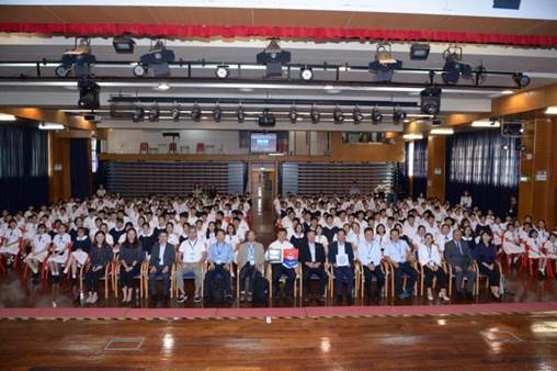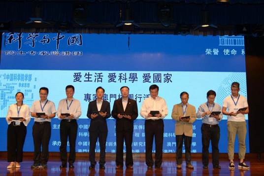 圖1:中央政府駐澳門聯絡辦公室經濟部副部長徐俊(中)、深圳先進院發展處處長畢亞雷(右四)、澳門培正中學校長高錦輝(左四)同六位中國科學院專家共同啟動“專家澳區校園行”活動