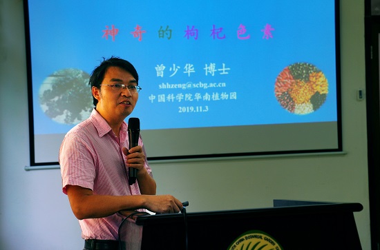 此次講壇由園藝中心副主任夏漢平研究員主持。主講人華南植物園曾少華博士帶來以《神奇的枸杞色素》為題的知識講座,向社會公眾展示枸杞功效最新的研究進展,以枸杞為例,講述植物色素的種類、植物色素對植物生長、繁衍等方面的作用;以及植物色素對人體健康方面的功能。