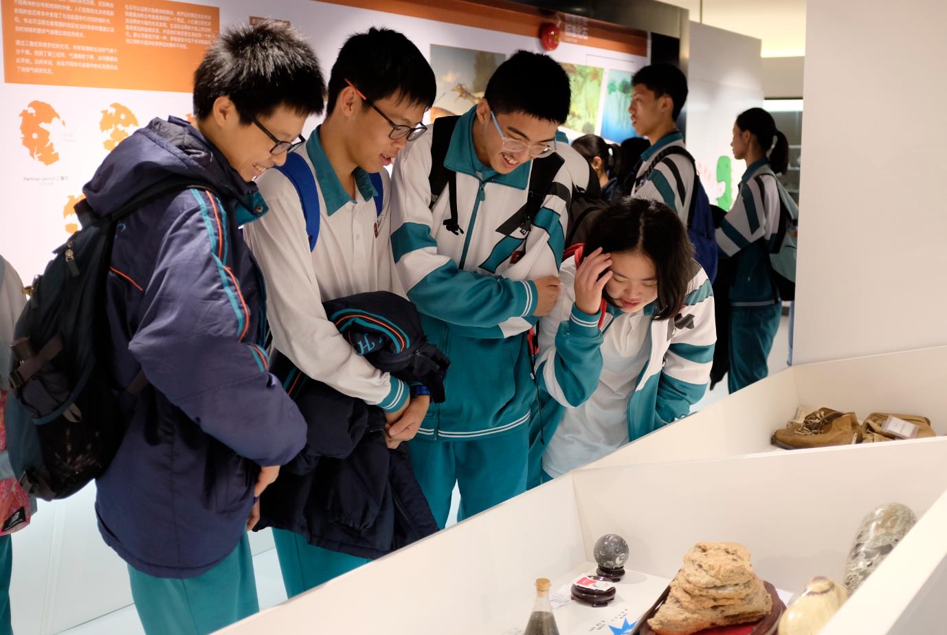 同學們來到科普陳列館一樓,老科學家志愿者為同學們講解了“宇宙形成與元素誕生”的相關知識,讓同學們對宇宙的起源和地球的形成有了一個宏觀的認識。在二樓展廳,大量的巖石、礦物、珠寶玉石以及琳瑯滿目的鳥類、魚類以及恐龍化石激發了大家強烈的求知欲,同學們興趣盎然地提出了大量問題,引發了熱烈討論。講解員結合各類展品,用通俗易懂、生動有趣的語言介紹了“地球的形成演化過程”“板塊運動”“地震和火山”“海水從哪里來”等基本地學知識;還講解了“生物大爆發”“生物大滅絕”“地質歷史上的幾次冰期和間冰期”等地質科學中的重大地質事件。同學們邊看邊聽,收獲頗豐。離開科普陳列館之前,同學們還一起觀看了科普視頻 《人類—超級進化版的魚》 ,系統全面地了解地球歷史中的生物演化階段與人類進化過程。