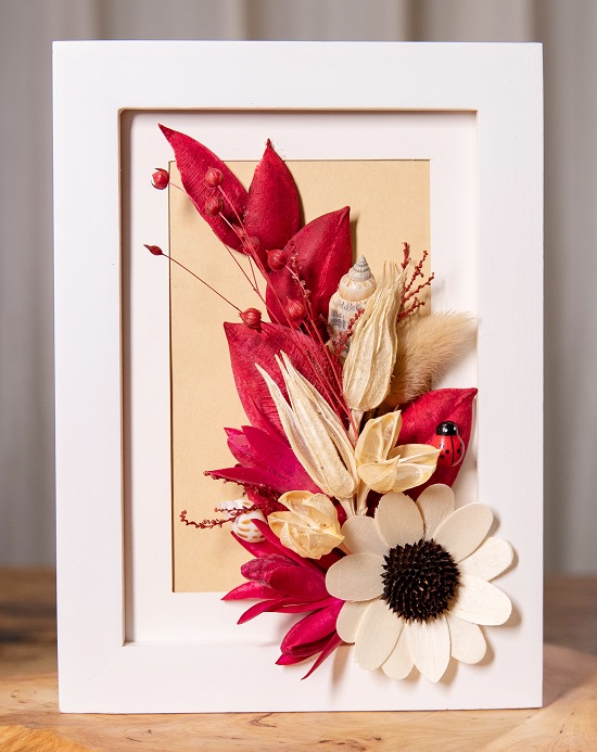 制作材料:玉蘭干花、黑心菊干花、泡桐果果殼、秋葵果實、相思豆、情人草干花、兔尾草、熱熔膠槍、枝剪、海螺、仿真昆蟲、相框。