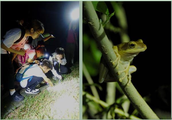 樹下是各類蛙喜歡的地方,穿著花夾克的花狹口蛙是今晚的主角,在好幾棵樹下都看到或沉思或發呆的它,這個喜歡學老牛叫的家伙,也許在等一場雨吧。褐云瑪瑙螺可以說是每一場夜觀的??土?,被列為十大入侵物種的它,自有其強悍的生存之道,不管人類喜歡與否,它就那樣安安靜靜地我行我素,在人類的圍追堵截下不斷繁衍。大眼萌樹蛙是每一次夜觀的明星,顧名思義,它是喜歡在樹上生活的蛙,它連孩子都要產在樹上,可見它有多喜歡樹上啊!看它的腳,你發現它爬樹的秘密了嗎?它還會飛檐走壁呢!