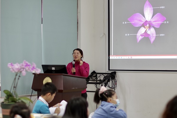 蘭花展主場在溫室,迎面就是大型沉浸式蘭花體驗展區,各式素雅的、端莊的、花枝招展、遺世獨立的蘭花錯落有致的展現在眼前。在老師引導下,大家贊嘆蘭花美麗之余,又仔細觀察記錄起來。蘭花結構獨特,其中間的花瓣特化成形狀特殊、色彩斑斕的唇瓣,上面連著合蕊柱(雄蕊、雌蕊合生在一起),專用于引導或引誘昆蟲幫其授粉,這種結構在植物界中是獨一無二的。在漫長的歲月里蘭花演化出各種匪夷所思的花朵結構和授粉機制,使這種曾與恐龍同時代的古老物種延綿至今,讓我們仍能欣賞其美麗,贊嘆其智慧!