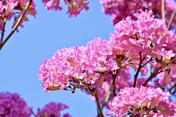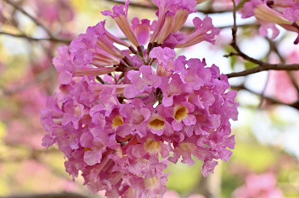 紫花風鈴木開花時,遠遠望去,繁花堆錦,滿樹紫紅或粉紅一大片,走進細看,花球壓枝,一簇簇結團成風鈴般隨風搖曳。