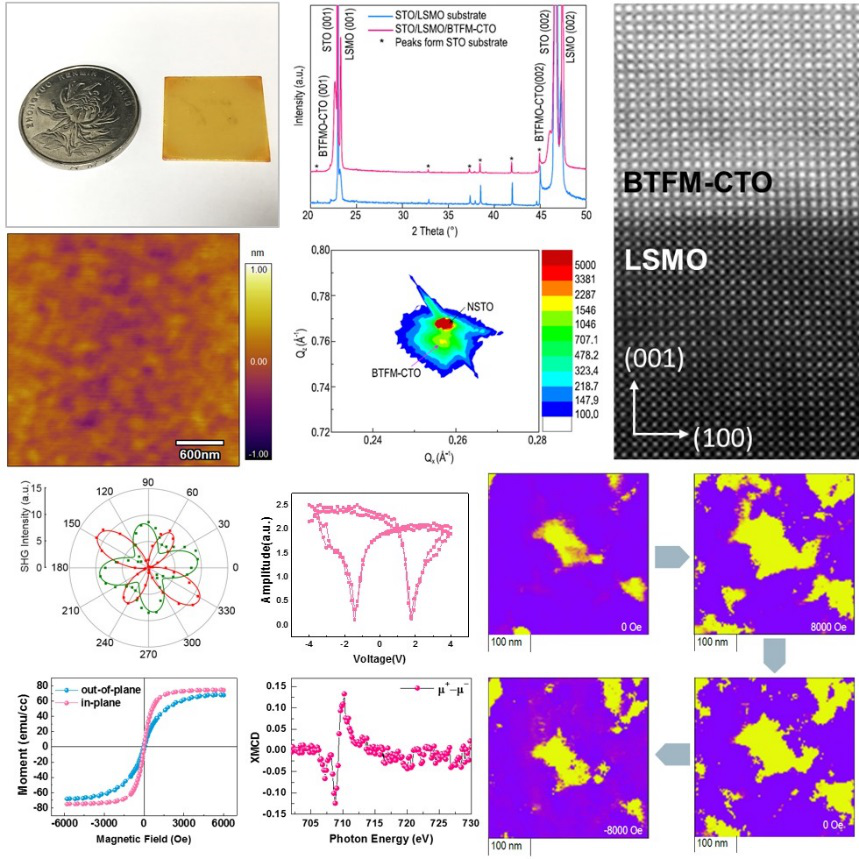 研究者使用掃描透射電鏡(STEM)、壓電力顯微鏡(PFM)、二次諧波發(fā)射(SHG)等測試手段,從不同的空間尺度表征了BTFM-CTO室溫下的強自發(fā)鐵電極化;結合X射線磁圓二色譜(XMCD)、極化中子反射(PNR)、超導量子干涉儀(SQUID)多種磁性測試方法,充分證明了其室溫弱鐵磁性質,并通過VFM-PFM觀察到BTFM-CTO外延薄膜在外加磁場變化下的面內極化翻轉。