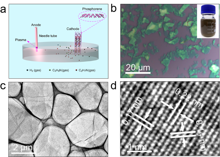 前期,團隊在黑磷烯液相超聲制備(Advanced Functional Materials 25 (45), 6996-7002),離子插層(Small Methods, 1900083;Materials Horizons 6 (1), 176-181)等方向做了大量工作。在本項工作中,基于多年的黑磷烯制備經驗和等離子體技術特色,團隊自主設計出等離子體液相制備系統,包括電源模塊、反應模塊等。通過高壓電源在陽極產生等離子體,作用于N,N-二甲基甲酰胺溶劑,等離子體中的活性粒子將N,N-二甲基甲酰胺分子分解,分解產物在電場驅動下對陰極黑磷晶體進行插層,同時在層間產生氣體,弱化層間力,使得黑磷晶體快速膨脹,從而高效地制備出高質量大尺寸的黑磷烯。同時由于制備時間短,此方法制備的磷烯氧化程度低,展現出優良的光電響應性能,這為黑磷烯作為高性能電子材料的應用奠定了基礎。