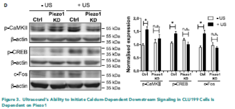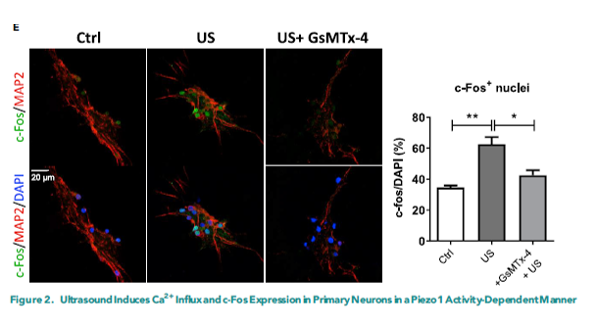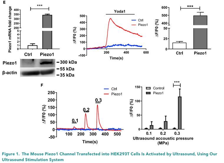 然而,超聲神經(jīng)調(diào)控作用基礎(chǔ)機(jī)理尚未明確。其中最有可能的一種假設(shè)是超聲作為一種機(jī)械波,可能與神經(jīng)系統(tǒng)中的生物機(jī)械敏感單元,如機(jī)械敏感通道、細(xì)胞骨架等相互作用,從而將機(jī)械波能量轉(zhuǎn)為神經(jīng)電化學(xué)信號(hào)。其中考慮到已經(jīng)報(bào)道的超聲誘發(fā)的即時(shí)響應(yīng)速度,以及較低的超聲能量等,機(jī)械敏感通道被認(rèn)為很可能在其中起到重要作用。此前研究顯示,兆赫茲超聲波及其激勵(lì)微泡振動(dòng)的情況下可以在非神經(jīng)細(xì)胞等體系中打開一種生物機(jī)械敏感單元Piezo1。本文主要研究可以透過顱骨的低頻超聲(500kHz)是否可以打開Piezo1,并誘發(fā)神經(jīng)元活動(dòng)。本文采用了不同的技術(shù)手段,對(duì)超聲的效果進(jìn)行檢測(cè),得到了相互印證的結(jié)果。