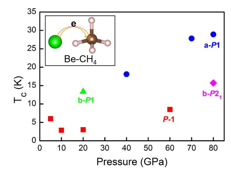 為解決上述問題,深圳先進(jìn)院鐘國華博士與其合作者基于粒子群優(yōu)化、密度泛函理論和密度泛函微擾理論,提出了一種實現(xiàn)絕緣體到金屬轉(zhuǎn)變的新思路,即通過在甲烷分子中摻雜金屬鈹。研究人員考慮了鈹摻雜甲烷分子的晶體結(jié)構(gòu)、電子態(tài)和動力學(xué)性質(zhì)以及電子-聲子相互作用。結(jié)果顯示,具有P-1空間群結(jié)構(gòu)的BeCH4在常壓下就可以轉(zhuǎn)變?yōu)榻饘賾B(tài),并發(fā)生超導(dǎo)轉(zhuǎn)變,隨著壓力的增加最高超導(dǎo)臨界溫度可以提高導(dǎo)近30K。這說明電子摻雜的CH4有希望成為一種兼具低壓和高臨界溫度的新型超導(dǎo)體。相關(guān)研究結(jié)果系統(tǒng)地揭示了這種新型超導(dǎo)體在不同壓強(qiáng)下空間結(jié)構(gòu)、金屬環(huán)和超導(dǎo)電性的變化規(guī)律,對于探索新型高溫低壓超導(dǎo)體具有重要的指導(dǎo)意義。