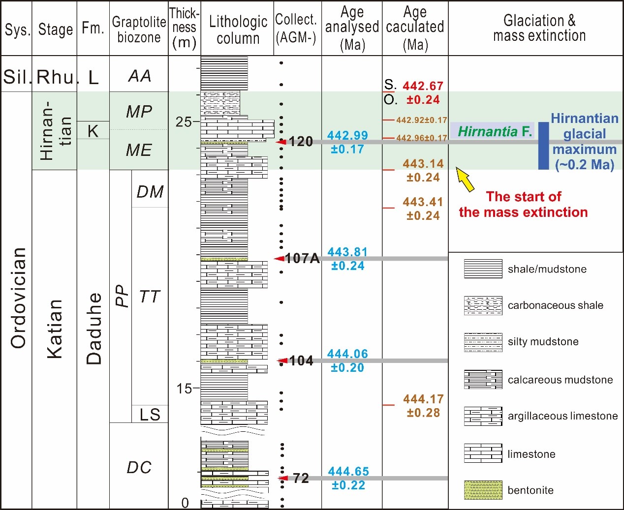 中國科學院廣州地球化學研究所、南京地質(zhì)古生物研究所和澳大利亞國立大學的相關(guān)研究團隊,經(jīng)過近8年的努力,在我國華南考察了百余條奧陶系——志留系界線剖面,最終對云南萬和新發(fā)現(xiàn)的一個連續(xù)完整的、出露良好的奧陶系—志留系界線剖面進行了高精度的系統(tǒng)古生物學、巖石地層學、生物地層學研究,并對剖面中厚度不等的23層斑脫巖層進行了單顆粒鋯石雙稀釋劑高精度熱電離質(zhì)譜(ID-TIMS)U-Pb定年,最終獲得了4個高精度年齡,分別是444.65 ± 0.22 Ma (Dicellograptus complexus 筆石帶中部),444.06 ± 0.20 Ma (Paraorthograptus pacificus 筆石帶下部),443.81 ± 0.24 Ma (Tangyagraptus typicus 筆石亞帶上部)和442.99 ± 0.17 Ma (Metabolograptus extraordinarius 筆石帶上部)。以這些年齡為基礎(chǔ),在詳細沉積學研究的基礎(chǔ)上,首次結(jié)合不同巖性的沉積速率差異,計算出赫南特階頂界(即奧陶系-志留系界線)(442.67 ± 0.24 Ma)和底界(443.14 ± 0.24 Ma),D. mirus 筆石亞帶底界(443.41 ± 0.24 Ma),T. typicus 筆石亞帶底界(444.17 ± 0.28 Ma),P. pacificus 筆石帶底界(444.38 ± 0.31 Ma)和D. complexus 筆石帶底界(444.84 ± 0.31 Ma )年齡。
