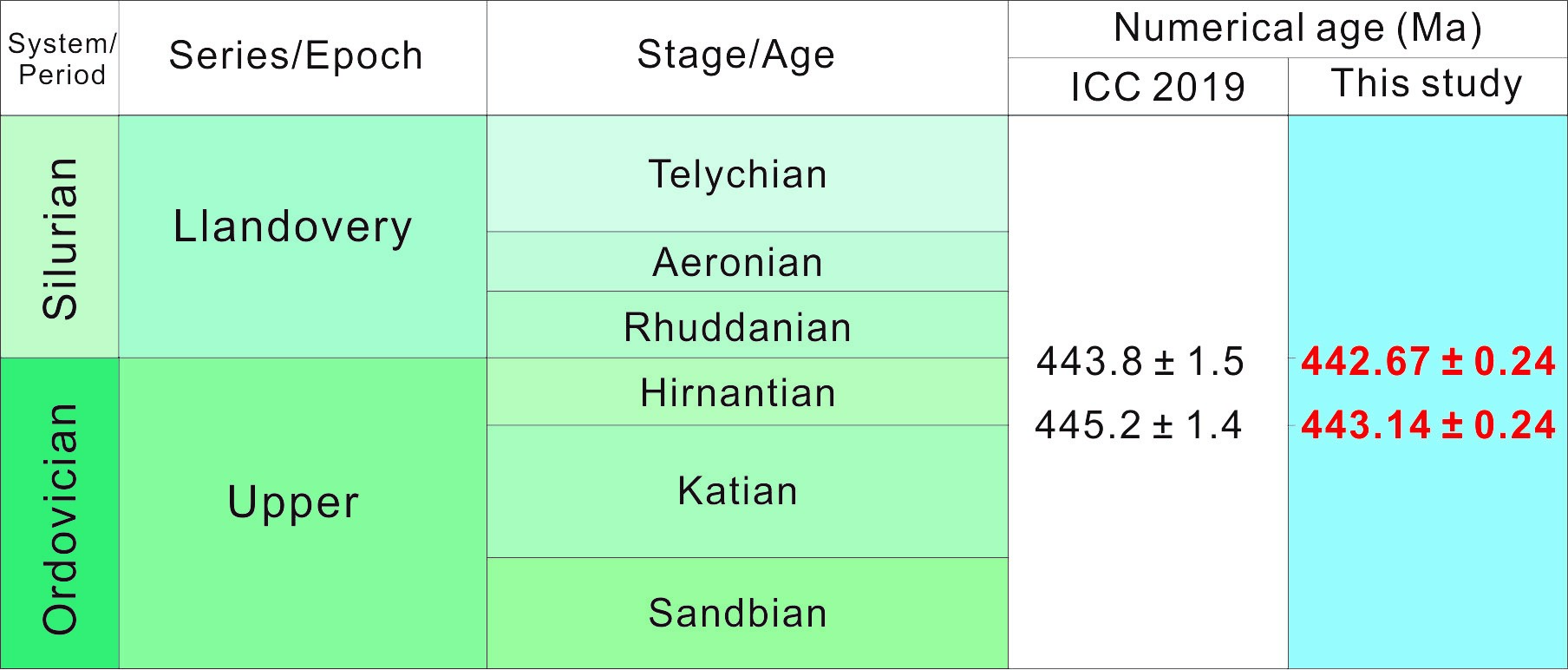 這些數(shù)據(jù)表明,赫南特階的時間跨度為 0.47 ± 0.34 Ma,明顯短于以前的推測 (1.4 ± 2.05 Ma,國際地層年代表ver. 2019/05)。赫南特盛冰期(Hirnantian glacial maximum)的持續(xù)時間為~0.2 Ma。