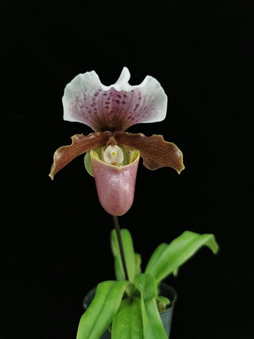 ‘中科紫斑兜蘭’(Paphiopedilum ‘Zhongke Ziban’)是2012年以引進的‘紅旗兜蘭CZ-1’(Paph. charlesworthii ‘CZ-1’)為母本、‘亨利兜蘭H-1’(Paph. henryanum ‘H-1’)為父本進行雜交,經(jīng)無菌播種繁育而成。多年多點試驗結(jié)果表明,其遺傳性狀穩(wěn)定一致。‘中科紫斑兜蘭’生長勢較旺盛,5.0厘米高試管苗種植35個月的開花植株,平均株高3.5厘米、株幅18.8厘米。葉片較平展,長矩圓形,近革質(zhì),葉色黃綠,平均長15.5厘米、寬1.8厘米。花序梗近直立、深紫色有細密絨毛,平均長22.0厘米;平均花橫徑6.5厘米、縱徑5.3厘米。中萼片紫紅色,有深紫色斑點,四周白色,平均長4.4厘米、寬5.3厘米;花瓣矩橢圓形,邊緣波紋狀;唇瓣盔狀,暗紫紅色。設(shè)施栽培條件下,12月至翌年3月開花,單花觀賞期38天,抗病性、抗逆性較強。‘中科紫斑兜蘭’屬兜蘭盆花新品種,與2018年我園自主選育的對照品種‘紫君兜蘭’相比,葉片更平展,葉面綠色無斑紋,花形更圓整,花瓣增寬69.2%。適合我省設(shè)施栽培。