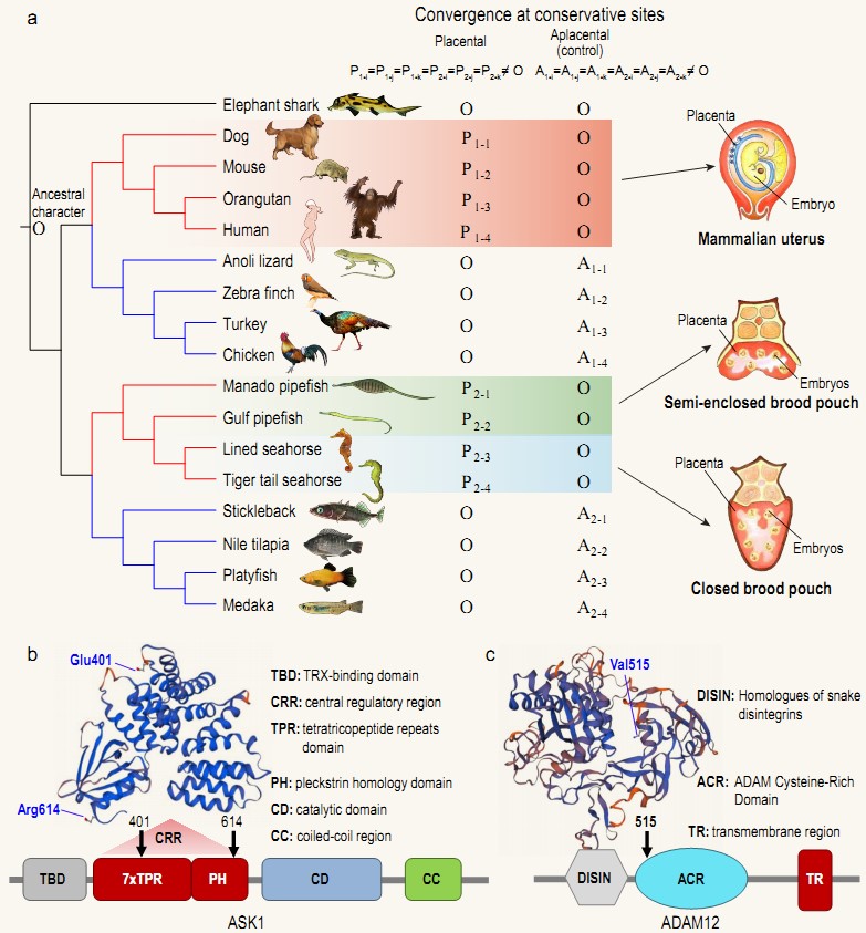 研究團隊通過多種海洋魚類全基因組比較與解析,揭示了海龍科魚類進化速率的特征(圖1);隨后,在對不同海龍科物種復雜性狀形成機制的分析過程中,發現了SCPPs、tbx4等功能基因在物種性狀進化過程中的關鍵功能,揭示了Pcdh基因家族在海龍科物種中顯著擴張,闡明non-clustered Pcdhs基因對于海龍科物種胎盤發育和胚胎著床的功能特征;該研究原創性地將海龍科物種的胎盤與高等哺乳動物的胎盤進行趨同進化研究,從全基因組層面進行深入挖掘,發現了海龍科魚類118個基因與胎盤類哺乳動物趨同進化,且這些基因參與了育兒袋內細胞增殖與凋亡、血管增生及胚胎發育等生命過程(圖2)。