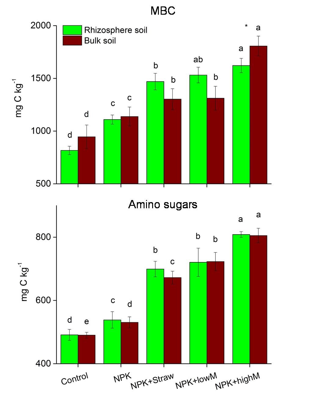 中國科學院亞熱帶農業生態研究所蘇以榮研究員團隊選取經過31年不同施肥處理稻田,研究了水稻根際土和非根際土中CUE、微生物生物量周轉和及其殘留物的積累特征。結果表明,秸稈和糞肥添加降低了根際土CUE,而對非根際土中CUE無顯著影響,且根際土中的CUE顯著低于非根際土(圖1)。究其原因,水稻根系分泌物的釋放和養分的吸收提高根際土C/養分比,使得C相對富余、養分缺乏,CUE降低。添加有機物料增加地上部生物量、進而增加根系分泌物釋放和根系吸收養分,促進以上根際過程,加強CUE降低趨勢。微生物CUE在非根際土中取決于呼吸作用,而在根際土中取決于其生長,這反映了微生物在根際土和非根際土中對有機碳利用存在差異。與單施化肥相比,添加有機物料提供了碳源,提高了微生物的生長速率,進而促進了微生物殘留物積累(圖2)。這項研究結果強調添加秸稈和糞肥盡管促進了根際土中微生物呼吸作用,但其通過增加微生物生物量的凈通量,進而促進微生物殘留物積累,從而提高水稻土碳固持,其結果為解釋不同施肥管理下水稻土固碳的微生物機制提供科學依據。