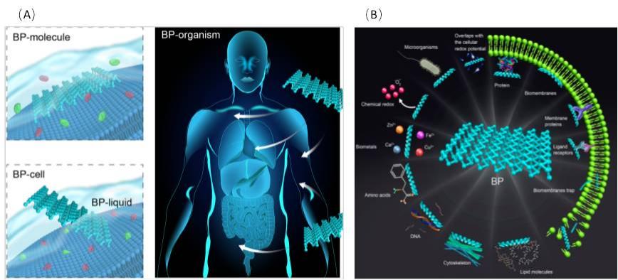 圖1.黑磷-生物系統(tǒng)界面及其相互作用示意圖