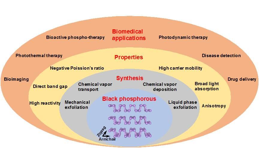 2. 黑磷的制備方法、性質(zhì)和生物醫(yī)用示意圖。