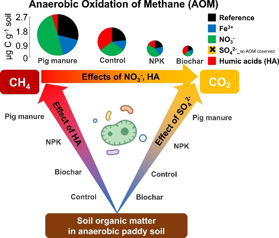 稻田是濕地生態系統中最重要的甲烷排放源之一,也是AOM發生的熱點場所。同時,稻田受到高強度的田間管理干擾,使其土壤物理化學生物特征與自然濕地存在顯著差異。為了探究稻田土壤中的AOM發生機制,中國科學院亞熱帶農業生態研究所吳金水研究團隊聯合德國哥廷根大學,利用同位素示蹤技術對不同施肥(不施肥,施用豬糞肥,生物炭和氮磷鉀肥)的稻田土壤,添加不同電子接受體(Fe3+, NO3-, SO42-和humic acids)進行厭氧培養。結果表明,添加NO3-使AOM速率增加了20-90%,但其在生物炭處理下與不施肥處理無顯著差異;AOM速率在豬糞肥處理下最大,其次是不施肥,氮磷鉀肥和生物炭處理最低。添加Fe3+使AOM速率在對照和豬糞肥處理下顯著降低,但生物炭和氮磷鉀肥處理下的AOM速率無顯著差異。添加SO42-使AOM速率顯著降低了5-51倍,但生物炭處理與對照相同。Humic acids使AOM速率降低了25-256%。本研究首次證明了有機電子受體(humic acids)是僅次于NO3-作為AOM的重要驅動力,在稻田土壤中至關重要(圖1)。而且,施用畜禽糞肥會在短期內增加土壤碳庫和促進溫室氣體的排放,但長期施用畜禽糞肥會減少溫室氣體的排放。本研究表明,氮磷鉀肥處理下甲烷的排放量是不施肥的3.2倍,而豬糞肥和生物炭處理下的甲烷排放量與不施肥處理無顯著差異。由于AOM速率在豬糞肥處理下的稻田土壤中最高,因此,在稻田的可持續管理中,應考慮長期施用畜禽糞肥,有助于減少甲烷的產生和較高的AOM,從而減少甲烷的排放。根據本文的AOM速率估算全球稻田AOM將有約3.9TgCyr-1的甲烷消耗量,大約是全球稻田甲烷排放量的10-20%。盡管這個估算帶有很大的不確定性,因此需要更多的研究來進一步確定AOM作為稻田中甲烷匯的貢獻性。該研究可為深入解析稻田減排潛力及稻田甲烷關鍵過程提供理論基礎和數據支撐。