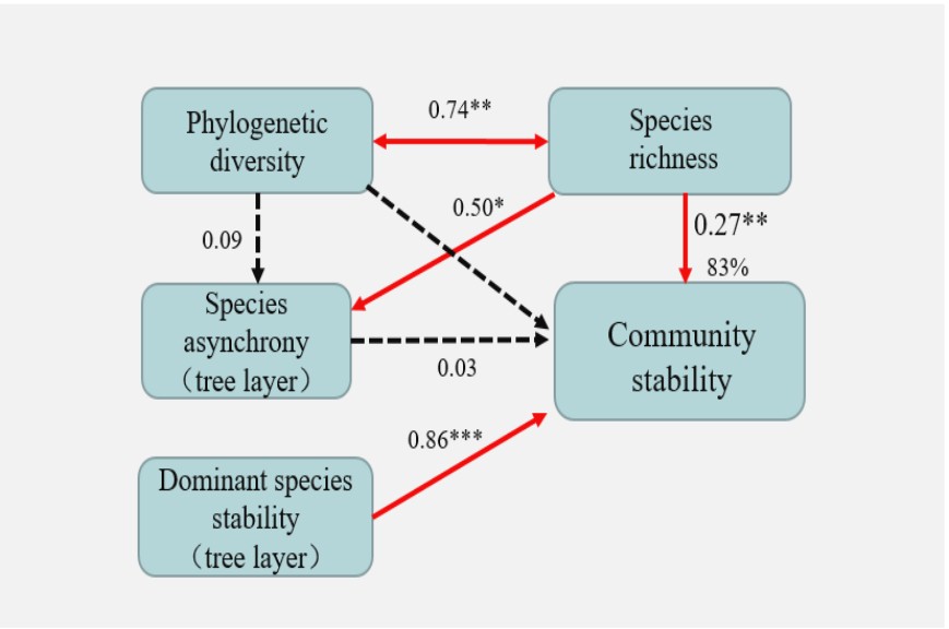 植物群落恢復(fù)過程中生物多樣性的保護(hù)與維持是生態(tài)學(xué)研究的重要內(nèi)容之一。通過分析植物群落結(jié)構(gòu)和系統(tǒng)發(fā)育結(jié)構(gòu)的變化可以更好地了解植被恢復(fù)過程中潛在的物種共存機(jī)制。此外,了解森林生物多樣性與生態(tài)系統(tǒng)功能的關(guān)系對(duì)于緩解氣候變化極為重要。以往的研究表明,物種多樣性、系統(tǒng)發(fā)育多樣性、物種異步性和優(yōu)勢度的增加可以維持草原群落生物量的穩(wěn)定性。然而,這些決定因素如何影響南亞熱帶森林地上和地下生態(tài)系統(tǒng)尚不清楚。