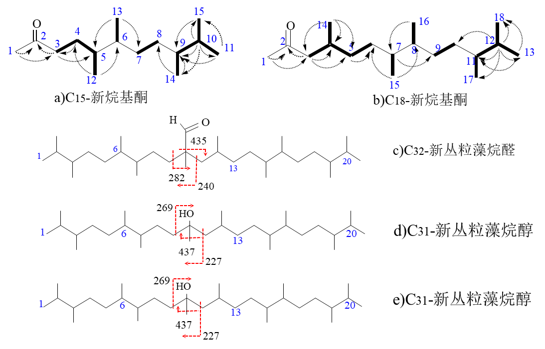 1)發(fā)現(xiàn)新C15、C18類異戊二烯烷基酮及3個含氧衍生產(chǎn)物:新C15、C18類異戊二烯烷基酮(5,6,9,10-四甲基-十一烷基-2-酮,4,7,8,11,12-五甲基-十三烷基-2-酮,圖1a, b)的結(jié)構(gòu)是由NMR解析發(fā)現(xiàn),并經(jīng)Lindeman and Adam碳化學(xué)位移經(jīng)驗理論驗證獲得;3個含氧衍生產(chǎn)物分別為C32-新叢粒藻烷醛(圖1c)、兩個C31-新叢粒藻烷醇(圖1d, e),其結(jié)構(gòu)由質(zhì)譜解析得到;