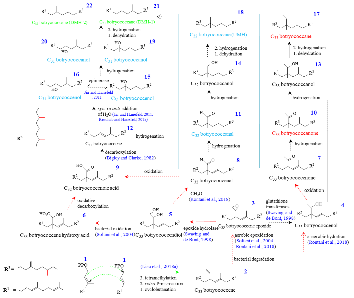 圖2 形成C33-、C32-、C31-新叢粒藻烷的后生物\沉積成巖演化路徑